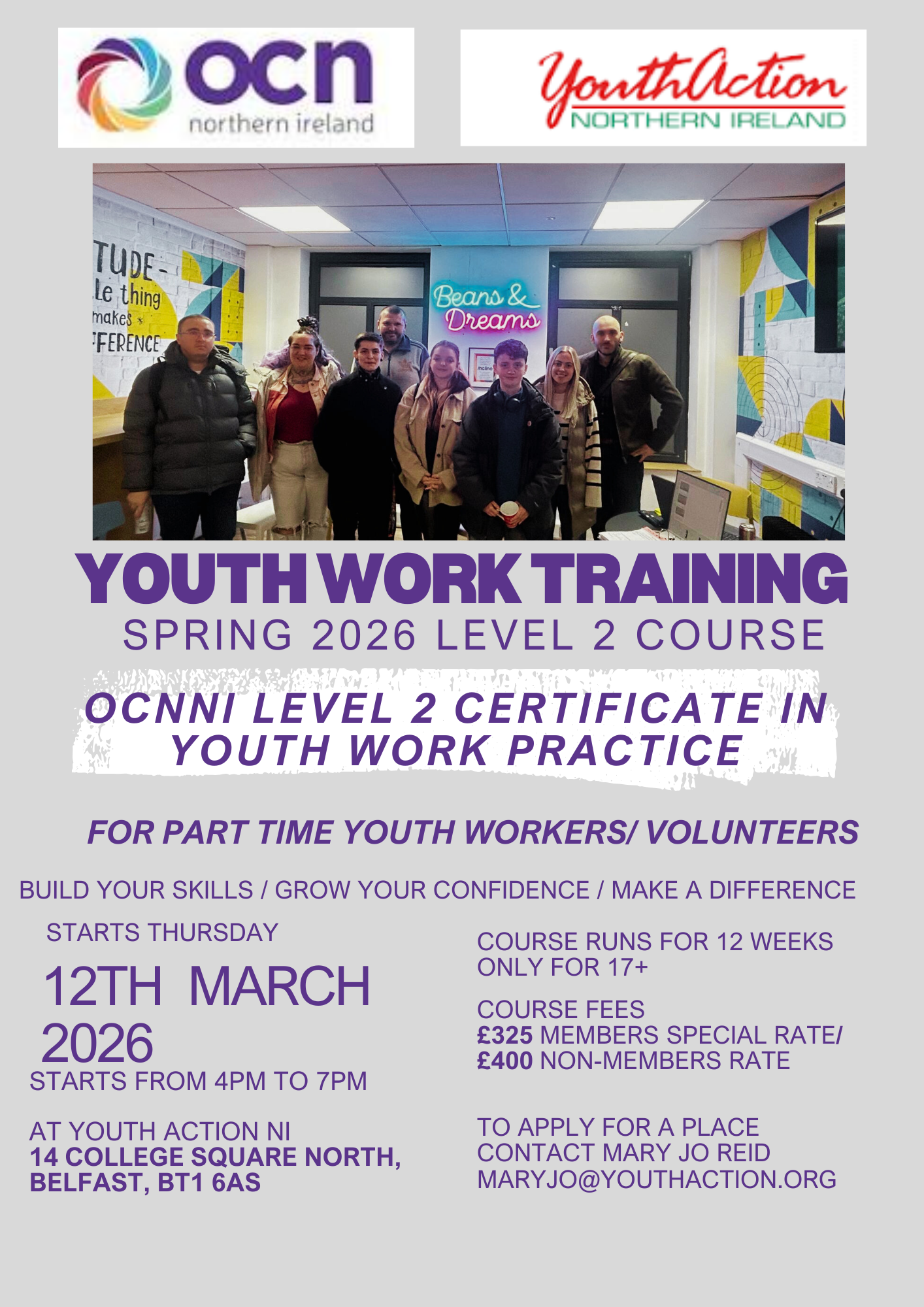 Starting Thursday 12 March 2026 at YouthAction NI, Belfast, this 12-week course combines professional development with hands-on learning in a supportive environment.